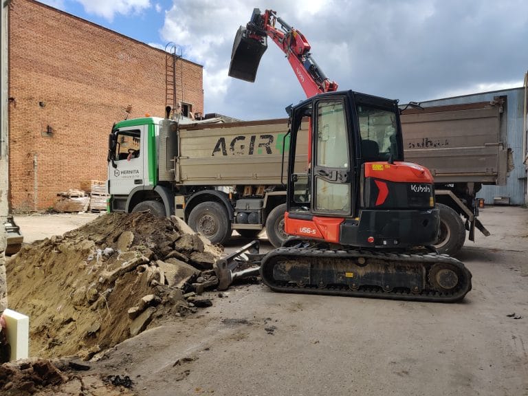 Pakrautas perteklinis gruntas pervežimui ar išvežimui į savivarčius. Ekskavatorius turi galimybę atlikti grunto pakrovimo darbus tiek į didelius…