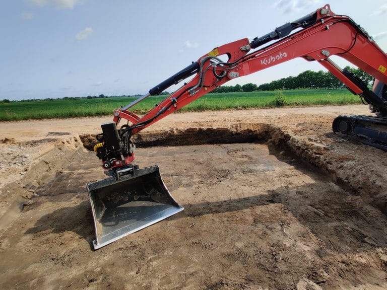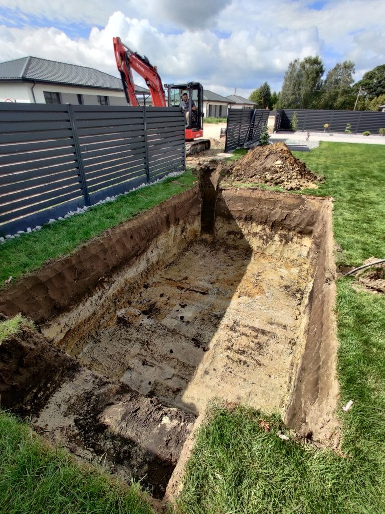 Iškastas lovys lauko baseinui. Dėka turimo Rototilt Indexator R2 priedo, baseino lovio kraštinės suformuotos su reikiamu nuožulnumu bei…