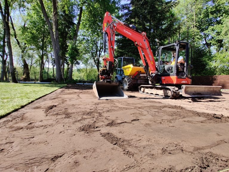 Suformuoti sklypų nuolydžiai su gruntu, paskleistas augalinis sluoksnis, panaudotas rotacinis lazerinis nivelyras, kad darbai būtų atlikti preciziškai. Naudota…