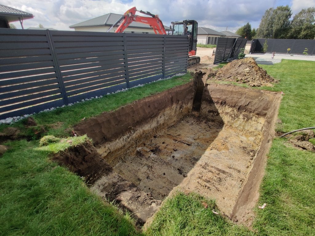 Iškastas lovys lauko baseinui. Dėka turimo Rototilt Indexator R2 priedo, baseino lovio kraštinės suformuotos su reikiamu nuožulnumu bei taip pat maksimaliai išsaugotas esamas sklypo gerbūvis.