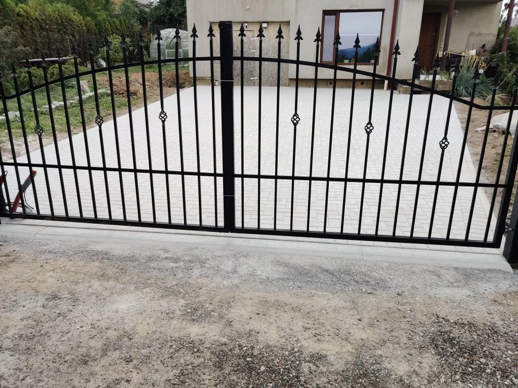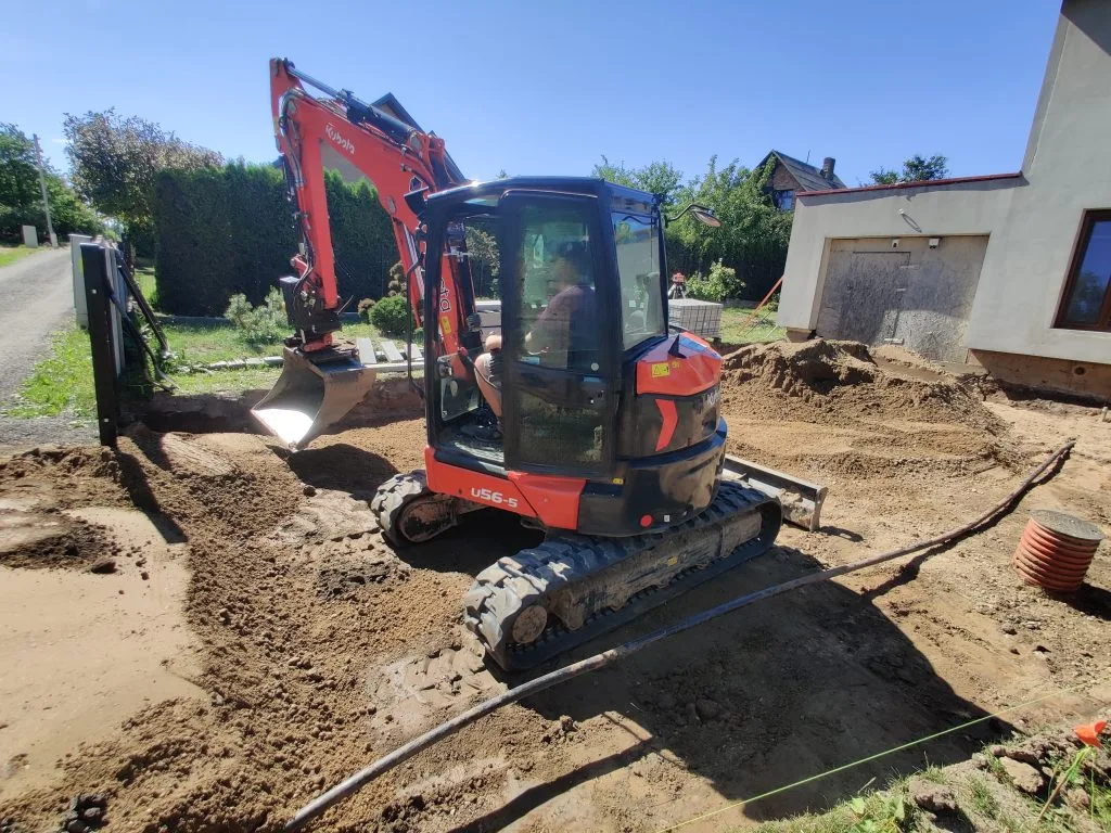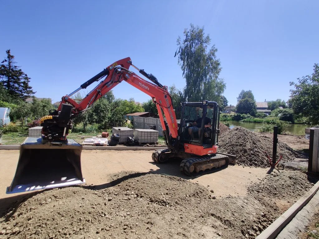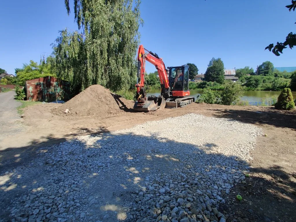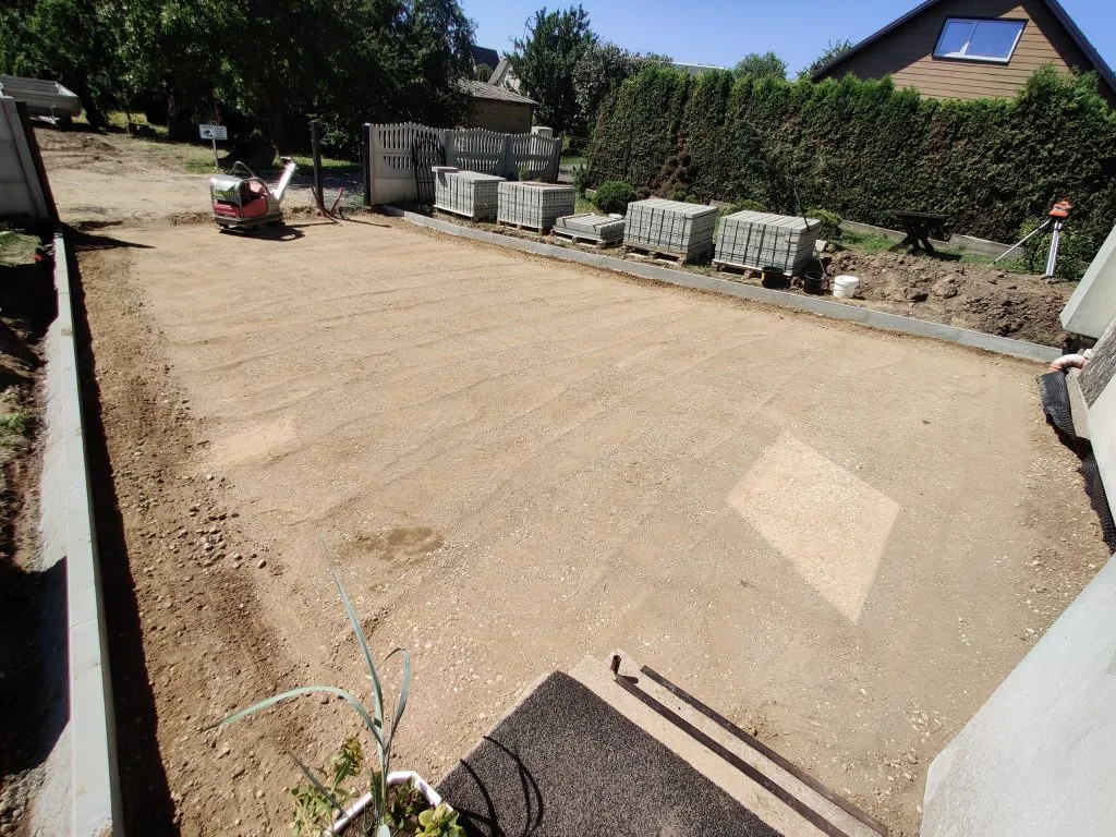 Iškastas lovys, įrengti smėlio-žvyro ir skaldos pagrindų sluoksniai, sudėti betoniniai vejos bordiūrai ir paklotos trinkelės. Perteklinis gruntas panaudotas gretimo sklypo palyginimui.