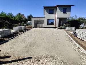 Iškastas lovys, įrengti smėlio-žvyro ir skaldos pagrindų sluoksniai, sudėti betoniniai vejos bordiūrai ir paklotos trinkelės. Perteklinis gruntas panaudotas gretimo sklypo palyginimui.